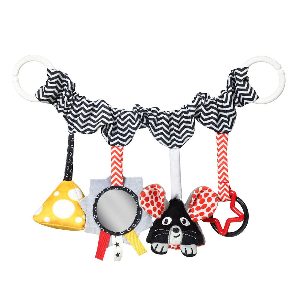 A kontrasztos Cheese and Skip egy szenzoros játék, amely serkenti a tapintást és a látást, valamint fejleszti a gyermek motoros készségeit. Rögzítse babakocsihoz, kiságyhoz vagy autósüléshez, hogy szórakoztassa babáját séta vagy utazás közben. A finom anyaggal borított részen négy darab van felakasztva: egy zörgõ sárga sajtdarab, egy biztonságos tükör színes cédulákkal, egy susogó fülû egér, valamint egy kör- és csillagkontúr. Az elemek érdekes választéka felfedezésre ösztönöz, és változatos dizájnjukkal és nagy kontrasztú színeivel felkelti a gyermek figyelmét. A baba egyszerre fog játszani, felfedezni a világot és tökéletesíteni szem-fül koordinációját.