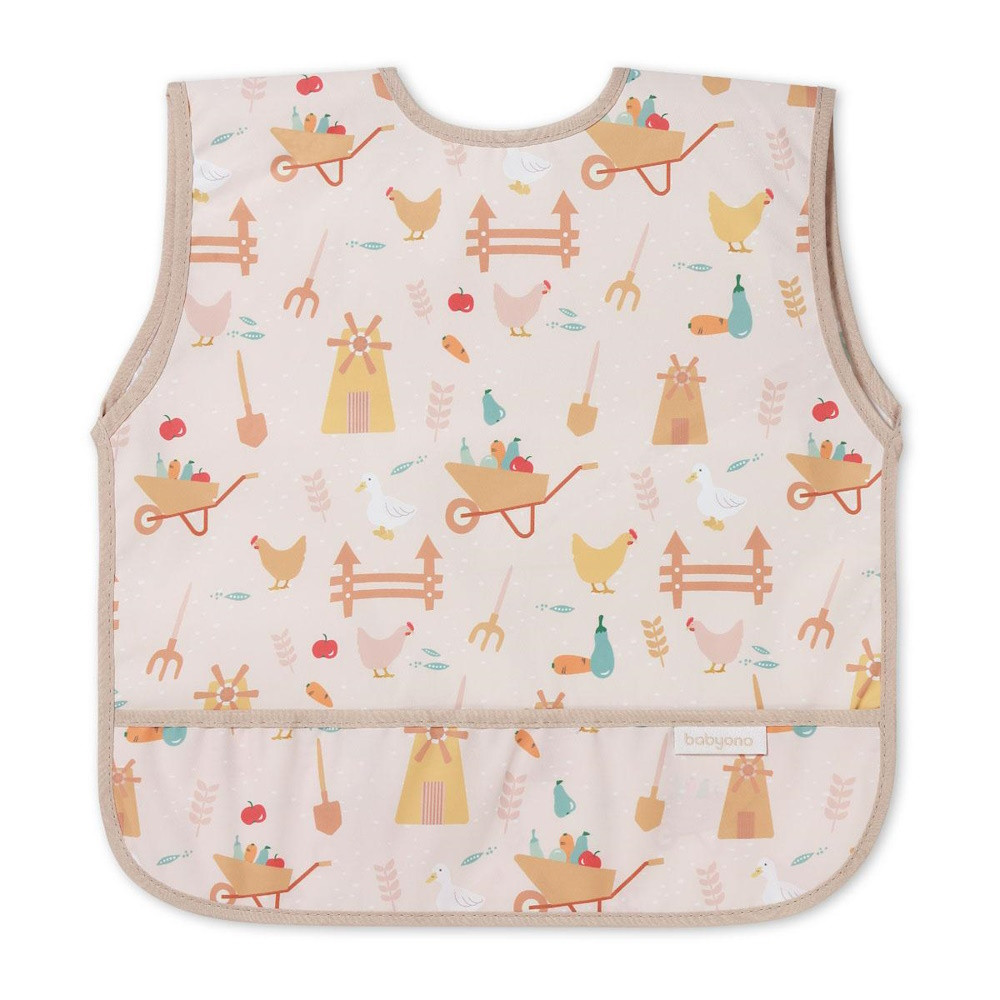 A kötényke megvédheti a baba ruháit a foltok ellen.