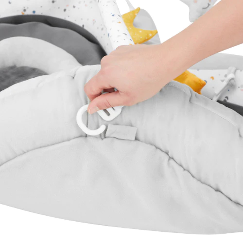 Ez a kivehetõ és áthelyezhetõ szûkítõ betét tökéletesen a hátán tartja a babát, és megnyugtató gubót alkot. A szõnyeg nagyon puha és kényelmes. Megemelt kontúrja párnázott. A babád nem gurul le a szõnyegrõl!