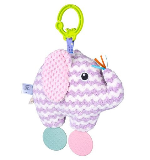 Ez a gyönyörű, pasztell színű házi kedvenc testét különböző textúrájú anyagokból készítették, ami stimulálja a gyermek tapintási érzékelését és elősegíti kognitív képességeinek fejlődését. Ezenkívül rágcsálnivalók és egy csengő is található rajta, amely az elefántocska hasában van elrejtve.