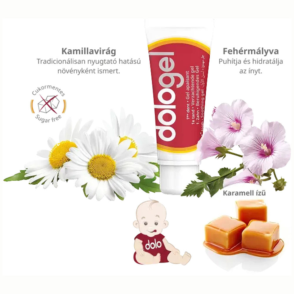 A dologel fogínygél már az elsõ fogak megjelenésétõl használható, amely puhítja és hidratálja az ínyt. Kamilla és fehér mályva természetes kivonatával a kellemes érzetért.