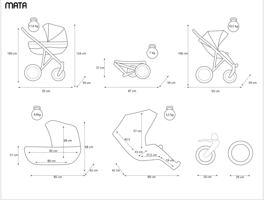 - Kerekekkel összecsukva: 87x59x37 cm, súlya 7 kg