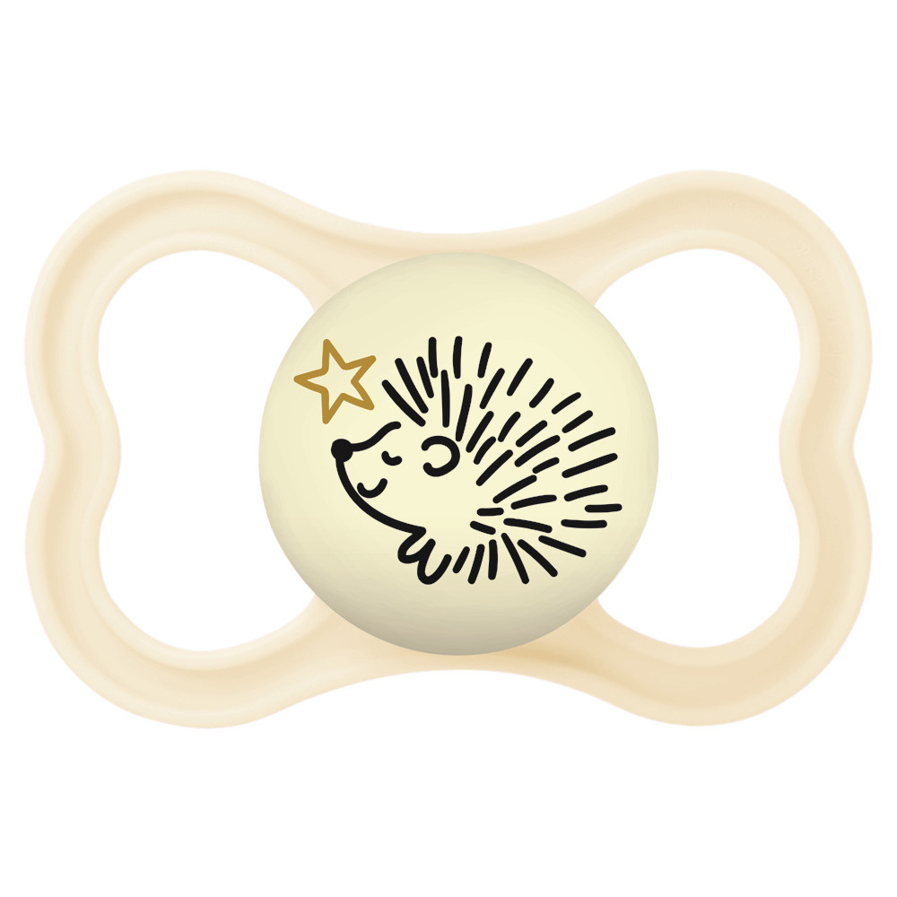 Az extra vékony és rugalmas szívóka lehetõvé teszi a zárt szájtartást, hogy a babák természetes módon tudják becsukni a szájukat cumizás közben. Ez a fogaknak elegendõ helyet hagy a normál növekedéshez. Az extra nagy szellõzõlyukaknak köszönhetõen különösen kíméletes a babák érzékeny bõréhez. A cumi gombja világít a sötétben.