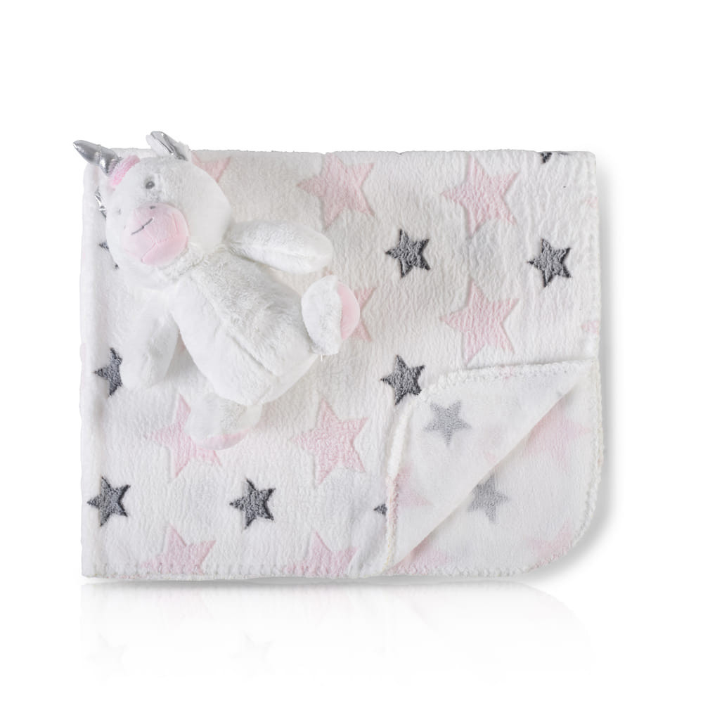 Ez a baba takaró egy különleges darab, amely nem csak melegen tartja a kicsit, de egyben egy szórakoztató játék is, mivel egy plüss unikornis van hozzá csatolva. Egy 90x75 cm méretű, puha, polár anyagból készült takaróról van szó, amely a legjobb választás a kuckózásra vagy ajándékozásra. Az unikornisos és csillag mintás design pedig minden kislány álma. Nem csak hasznos, de nagyon cuki is, tökéletes választás bármilyen alkalomra.