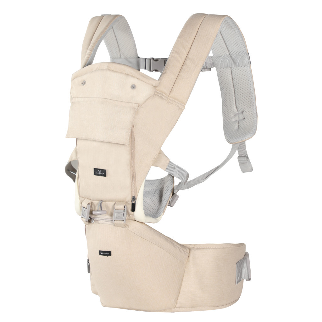 Alkalmas 5 hónapos kortól 15 kg-os korig. Poliészterből készült, a jobb szellőzés érdekében hálós belső béléssel. Három hordozási pozíció: a szülővel szemben, előre néző helyzetben CSÍPŐN és háton. Levehető kapucnival, pamut párnázással a vállpántok és a lábak területén. Elülső zseb cipzárral és hálós résszel az izzadás megelőzése érdekében. Szétcsatolható, ahogy a nő a gyermek. Külön is használható, szilárd alap/ülés, tárolózsebbel. Egyenletesen elosztja a gyermek súlyát anélkül, hogy megterhelné a szülő hátát és derekát. Kézi mosásra alkalmas. Az öv hossza: 123 cm. Gyönyörű világos színek