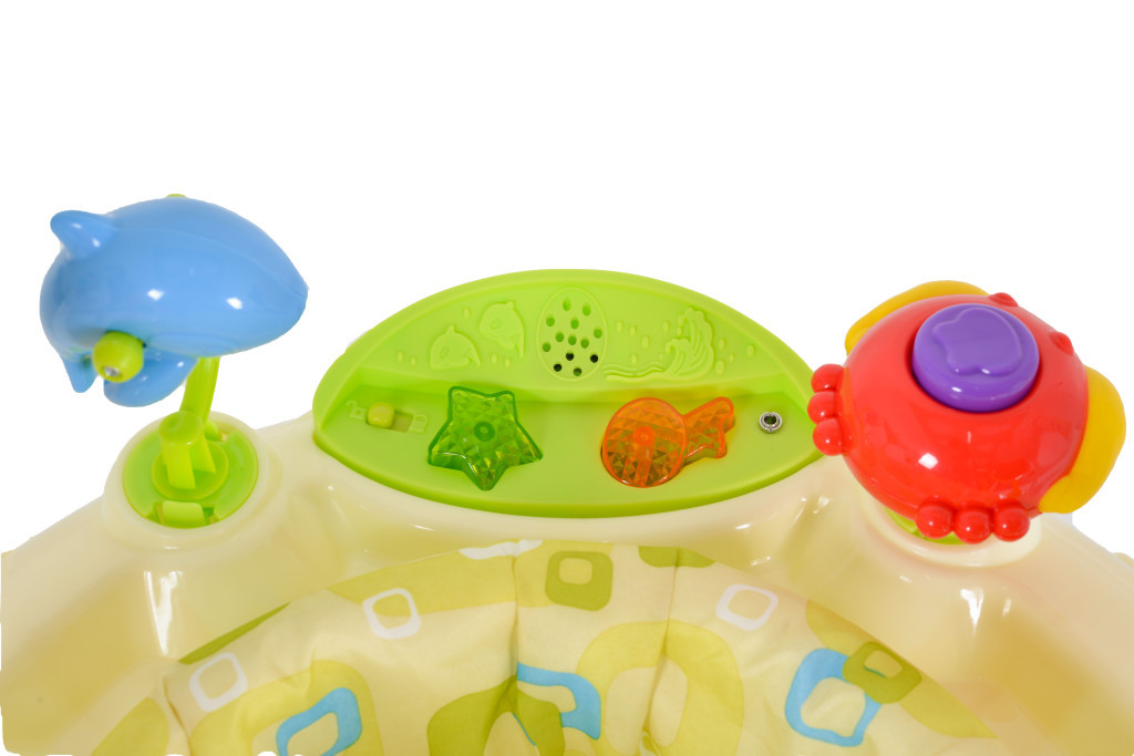 A beépített interaktív játékok különböző élénk színekben és formákban, valamint a fényekkel és két hangerősséggel ellátott zenélő tábla fejlesztik a