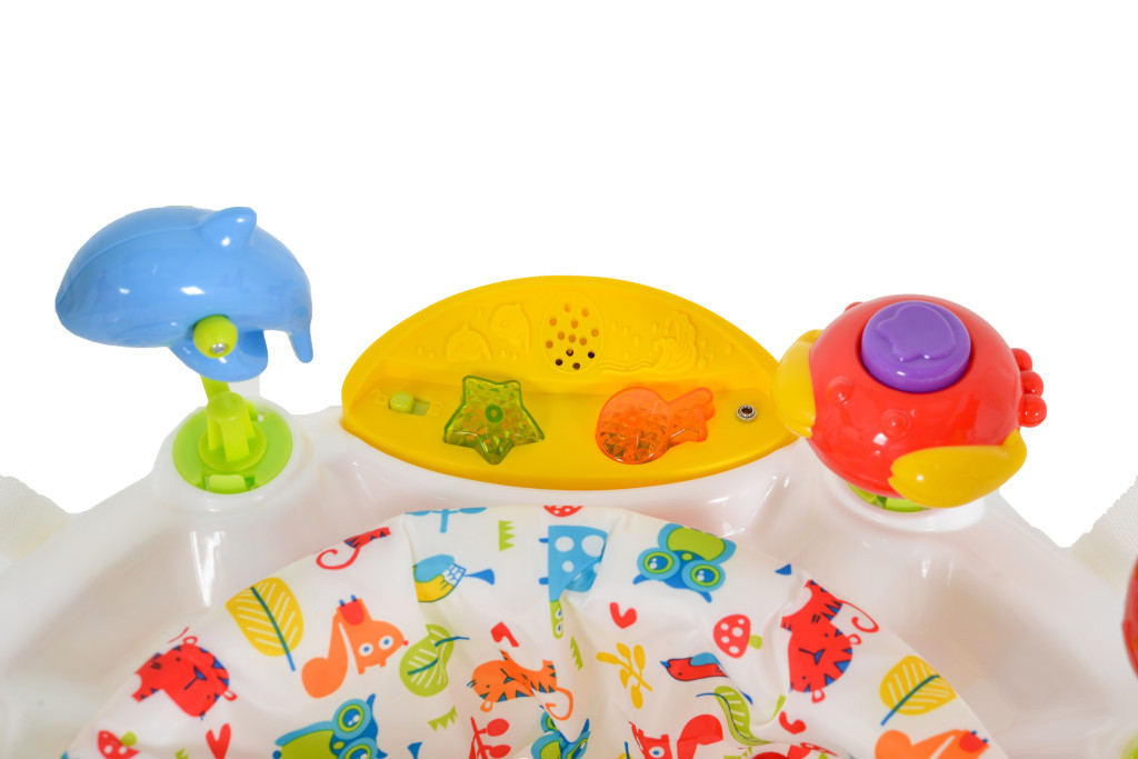 A beépített interaktív játékok különböző élénk színekben és formákban, valamint a fényekkel és két hangerősséggel ellátott zenélő tábla fejlesztik a