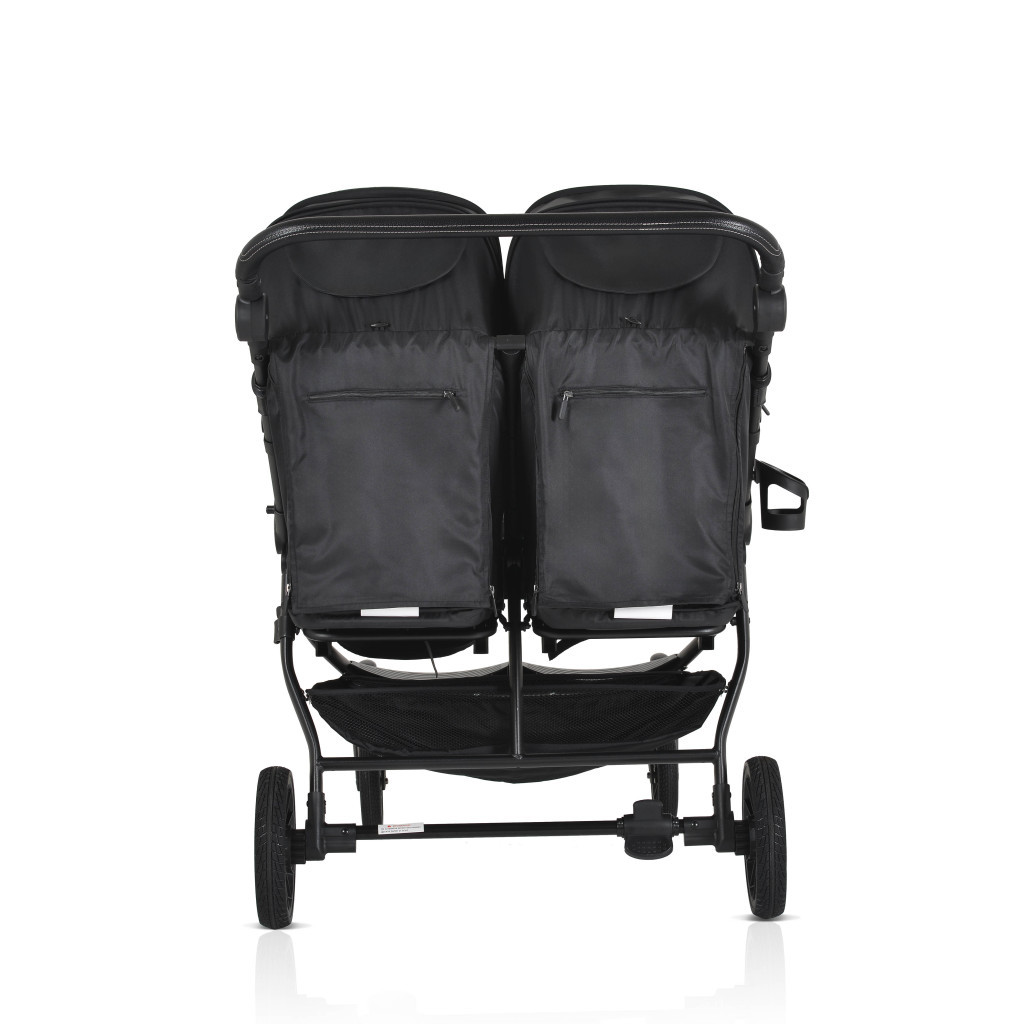 Az iker babakocsi születéstől körülbelül 36 hónapos korig alkalmas, legfeljebb 15 kg súlyú gyermekek számára. Három pozícióban dönthető háttámlával rendelkezik, beleértve a teljesen sík helyzetet, és egy hálós részt a jobb szellőzés érdekében. A kupola állítható, napellenzővel és hálós ablakkal a megfigyeléshez. A fogantyú állítható, öt pozícióban, varrott PU bőrből készült. Az 5 pontos biztonsági öv puha párnázással gondoskodik a biztonságról. A babakocsi első PU kerekekkel van felszerelve, amelyek 360 fokban forognak, reteszelő mechanizmussal és lengéscsillapítókkal minden keréken. A kerekek egy gombnyomással egyszerűen eltávolíthatók. Kompakt és könnyen összecsukható. Levehető PU bőr lökhárító rúd és három pozícióban állítható lábtámasz. A háttámlán tárolózseb áll rendelkezésre a tartozékok számára. A készlet praktikus cipzáras lábvédőt és pohártartót tartalmaz.