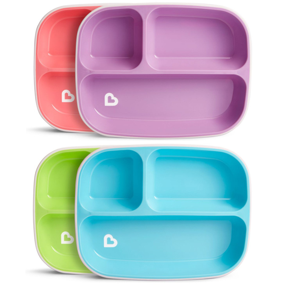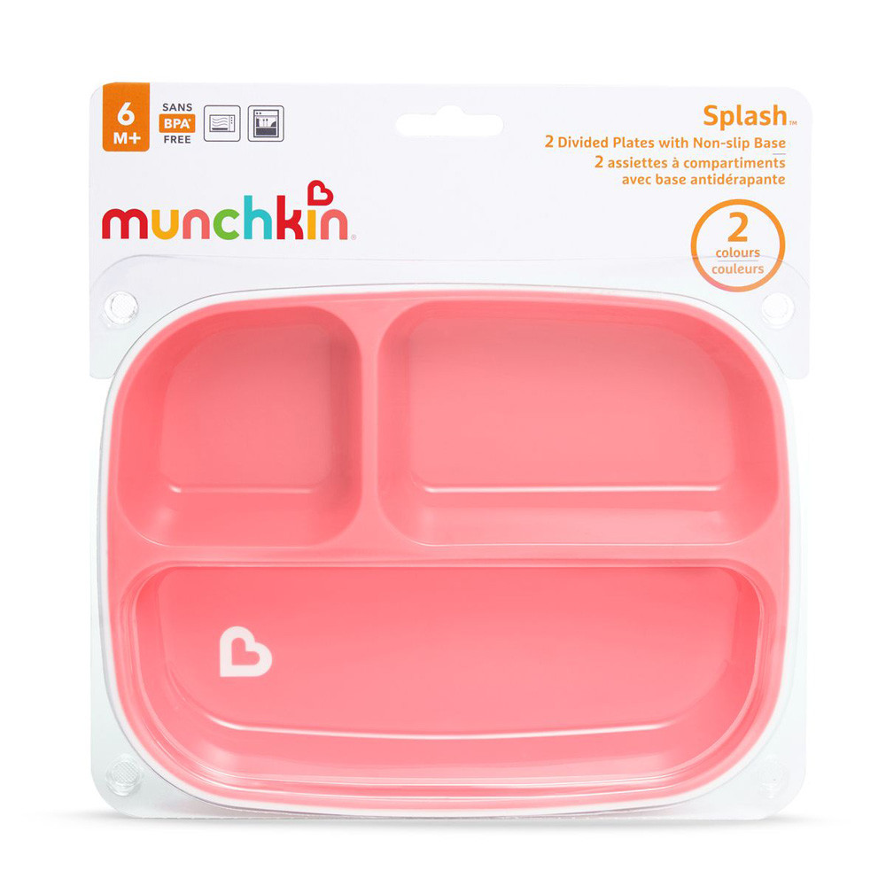 A Munchkin Splash háromrekeszes tányér nélkülözhetetlen eszköze a babákkal közösen elfogyasztott reggelinek, ebédnek és vacsorának. A három különbözõ rekeszben három különféle ételt tudsz szépen elkülönítve tálalni, míg a csúszásmentes alj segít, hogy kisebb legyen a rendetlenség az étkezések során.