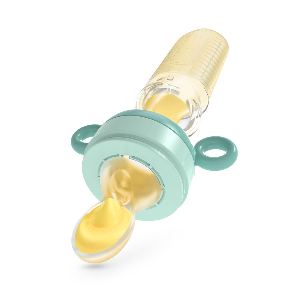 A hosszúkás mérõtartály, amelybe az étel kerül, rugalmas szilikonból készült. Ennek köszönhetõen a gyermek saját magának is összenyomhatja vagy összenyújthatja az ételt, úgy, hogy ujjai között gyúrja, mint egy csövet.
