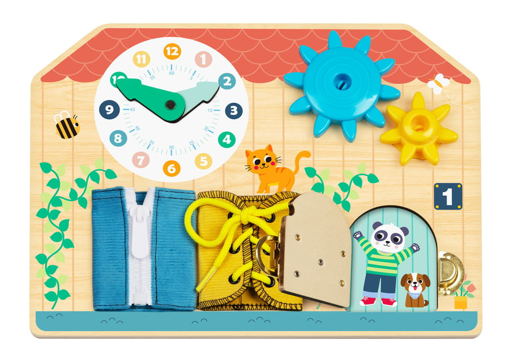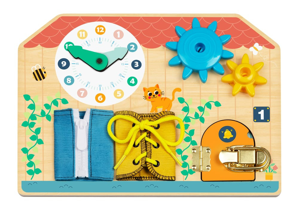 Ez a fa foglalkoztató tábla egy színes és szórakoztató játék, amely igazi kalanddá varázsolja a tanulást. Ház alakú, vidám állatos illusztrációkkal, és számos elemet tartalmaz - egy mozgó mutatókkal ellátott órát, forgó fogaskerekeket, cipzárt a nyitáshoz és záráshoz, egy lakatot és egy kis ajtót, amely mögött a gyermek egy rejtett képet fedezhet fel.