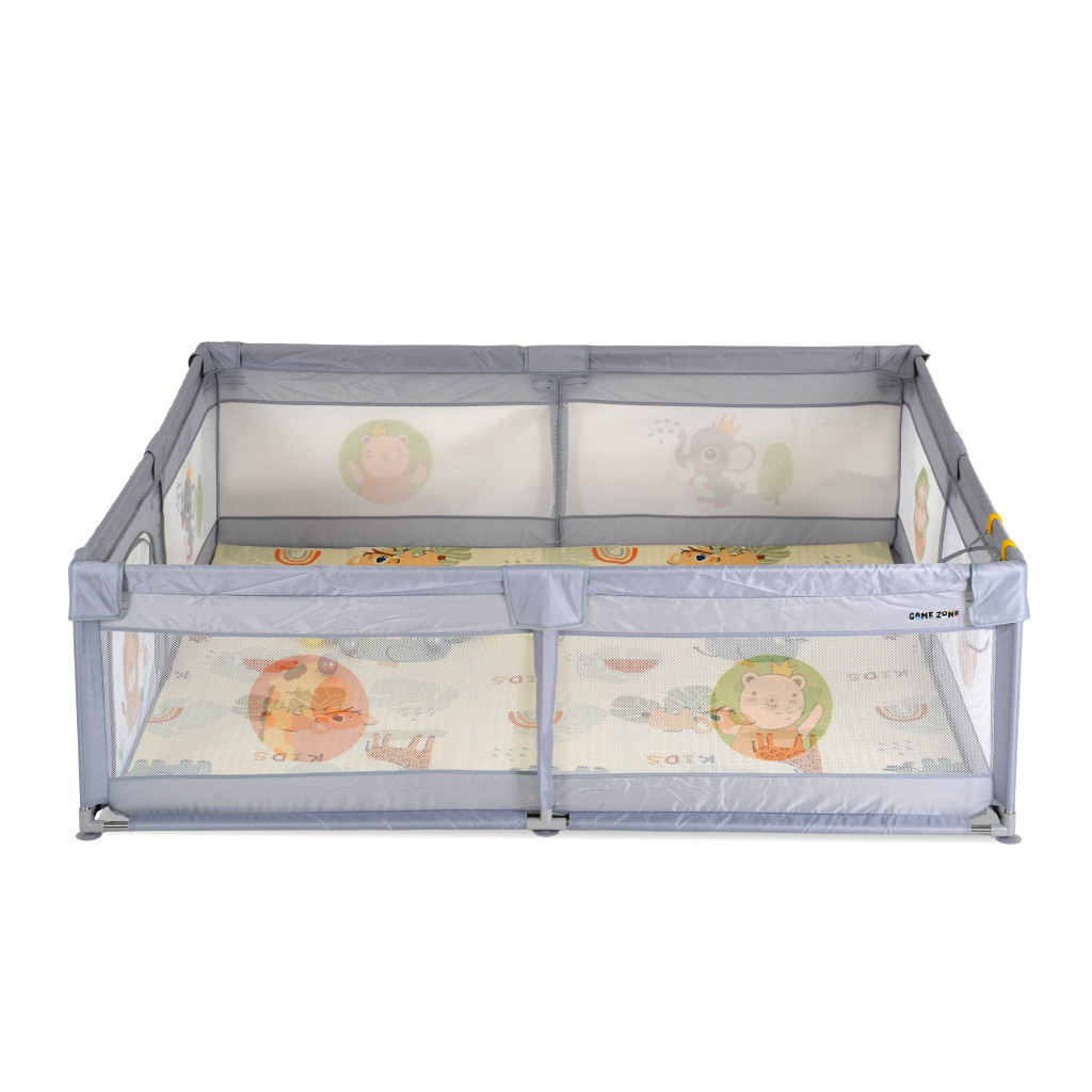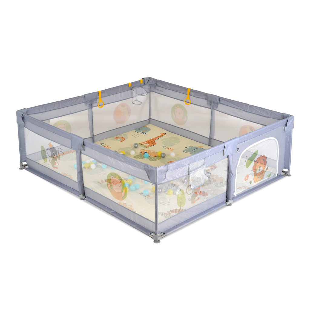MONI Gamezone összecsukható járóka szőnyeggel, 60 labdával 180x200 szürke
