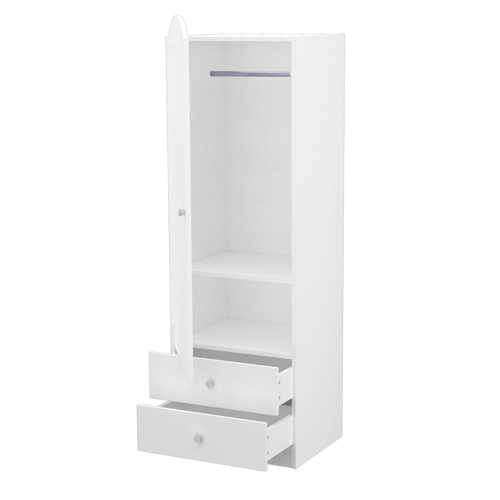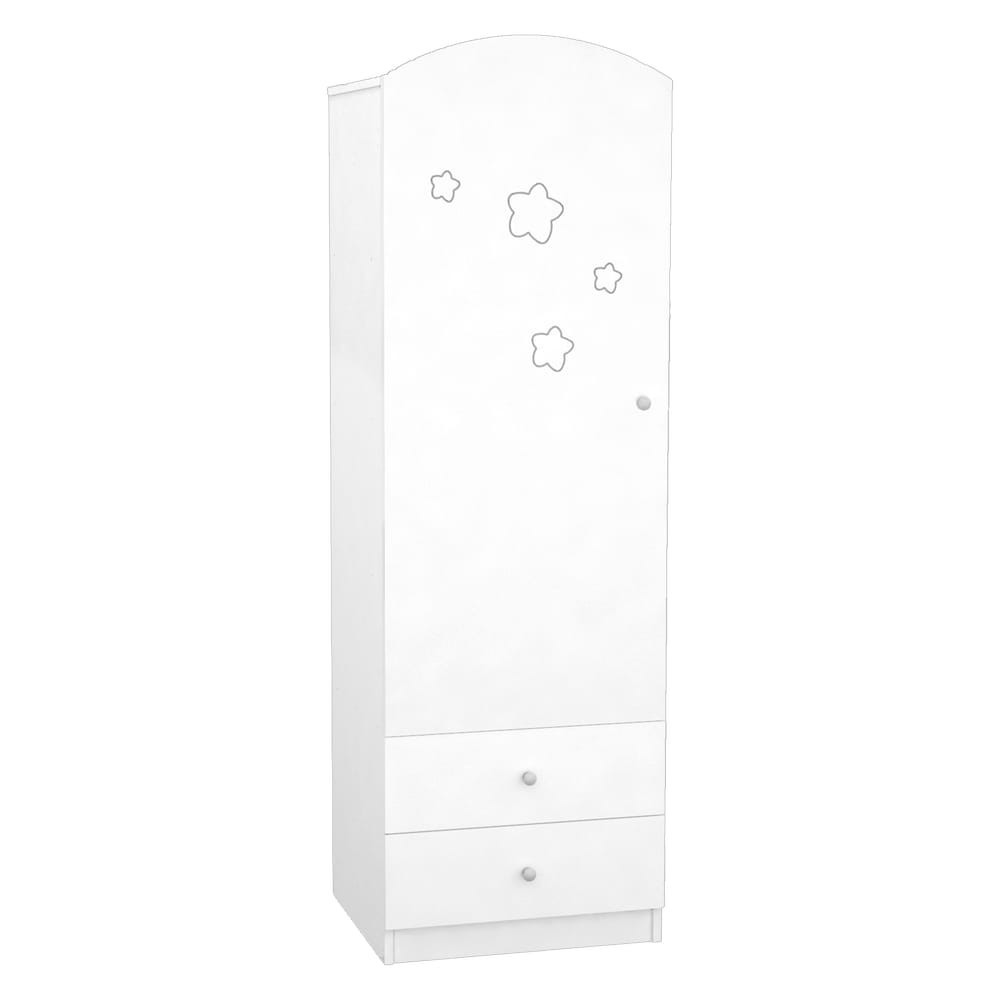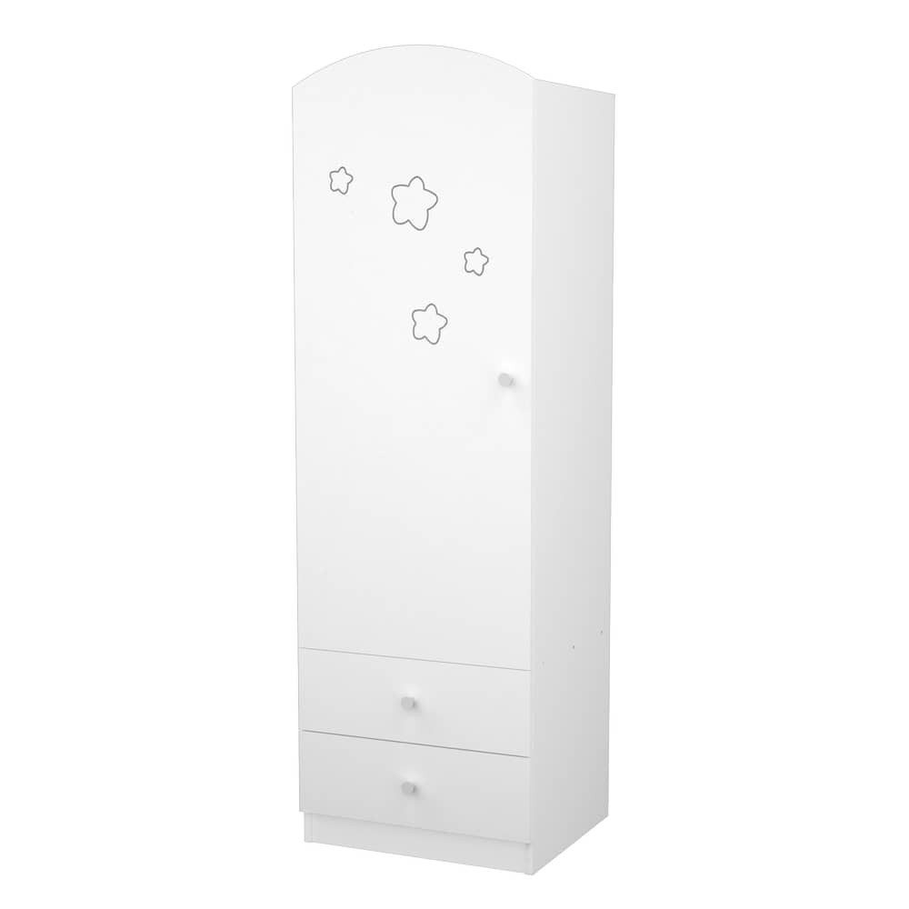 Állószekrényünk kialakításánál arra törekedtünk, hogy kényelmesen pakolható és praktikusan kihasználható legyen. Az ajtó mögött polcok (3db)és vállfaakasztó (1db) egyaránt megtalálható, alul két fiók segít abban, hogy minden dolog a helyére kerüljön. Lekerekített formái és hófehér színe eleganciát, míg mart csillagos mintája vidámságot csempész minden gyerkőc szobájába. A termék megalkotásakor gondoltunk a változó igények kielégítésre, így a terméket úgy alakítottuk ki, hogy tetszés szerint szabadon változtathatók az ajtók mögötti polcok és akasztók elhelyezkedése, ahogyan az a legpraktikusabb Ön és gyermeke számára. Az ajtó gázcsillapítású, önzáró pánttal felszerelt.