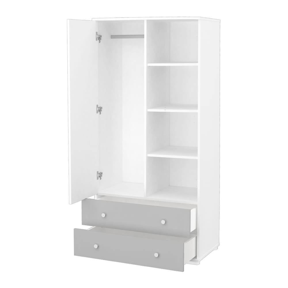Állószekrényünk kialakításánál arra törekedtünk, hogy kényelmesen pakolható és praktikusan kihasználható legyen. Az ajtó mögött polcok és vállfaakasztó egyaránt megtalálható, alul két fiók segít abban, hogy minden dolog a helyére kerüljön.