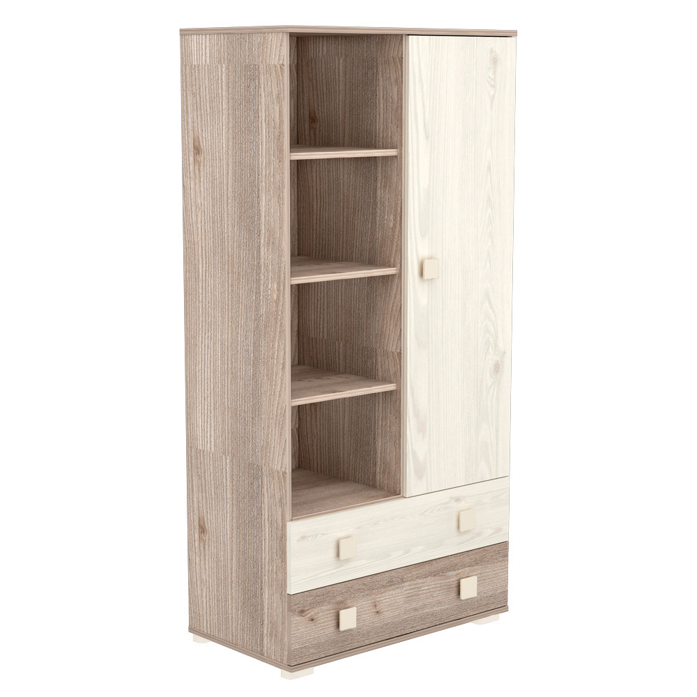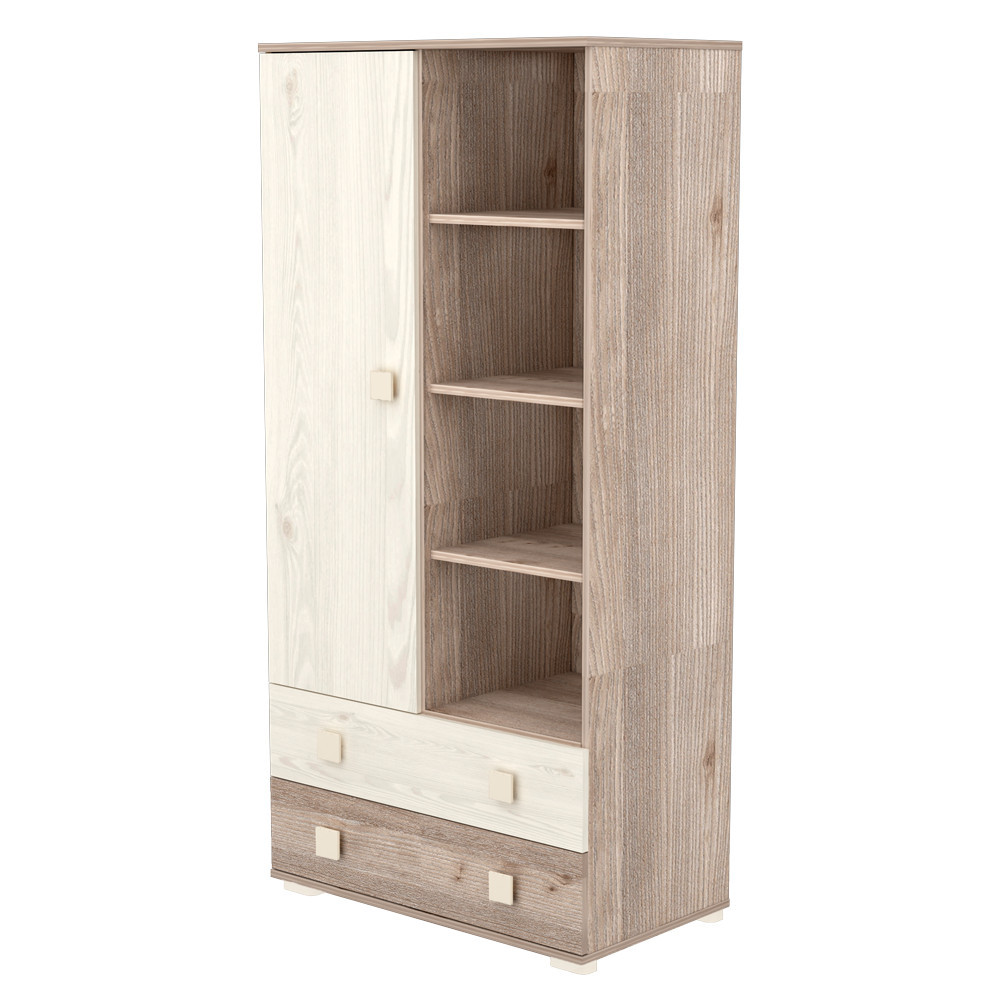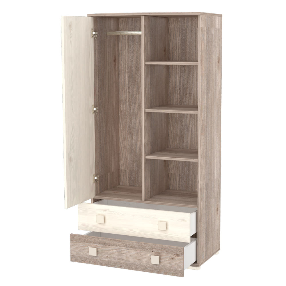 Állószekrényünk kialakításánál arra törekedtünk, hogy kényelmesen pakolható és praktikusan kihasználható legyen. Az ajtó mögött polcok és vállfaakasztó egyaránt megtalálható, alul két fiók segít abban, hogy minden dolog a helyére kerüljön.