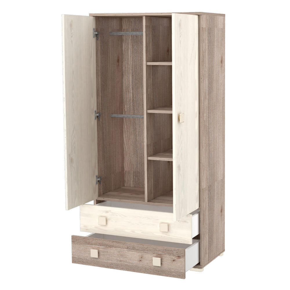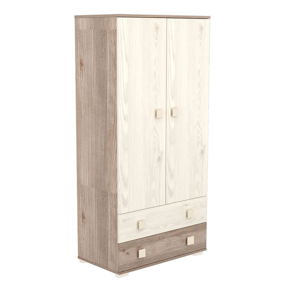 Állószekrényünk kialakításánál arra törekedtünk, hogy kényelmesen pakolható és praktikusan kihasználható legyen. A két ajtó mögött polcok és vállfaakasztó egyaránt megtalálható, alul két fiók segít abban, hogy minden dolog a helyére kerüljön. A termék megalkotásakor gondoltunk a változó igények kielégítésre, így a terméket úgy alakítottuk ki, hogy tetszés szerint az ajtók egyike levehető, így egy szinte teljesen új bútorrá alakulhat át a szekrény. Mindemellett szabadon változtathatók az ajtók mögötti polcok és akasztók elhelyezkedése, ahogyan az a legpraktikusabb Ön és gyermeke számára. Az ajtó gázcsillapítású, önzáró pánttal felszerelt.