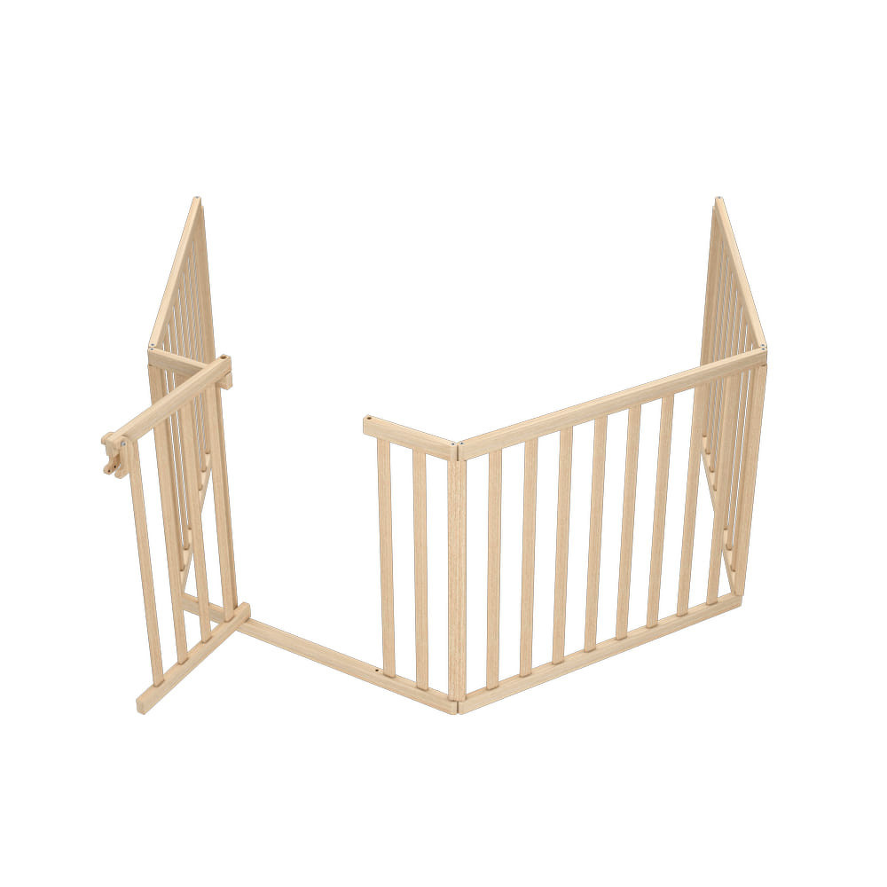 A termék összesen 8 elemből áll, 7 darab kerítés, és 1 db ajtóból, melyek mindkét irányban harmonika-szerűen összehajthatóak, így tárolása egyszerű és praktikus. Az elemek sokrétűen kombinálhatóak, szükség szerint a rendelkezésre álló tér formájához igazíthatók, így tetszőleges számú elem felhasználásával lehet bővíteni vagy szűkíteni a bútort. A hajlatok flexibilisek, így az egyes részek egymáshoz képest elfordíthatók és tetszőleges alakzatba rendezhetők. Az oldalelemek egymáshoz rögzítése a sarokpontokon található végelemekkel történik, így a kívánt alakzat fixen rögzíthető. Az elemek alján 2 db csúszásgátló szalag teszik még biztonságosabbá a terméket. Az ajtó mindkét irányba nyitható, ami egyszerűvé és gyorssá teszi az áthaladást. A terméket a falhoz is rögzíthetjük, melyhez a csomagolás tartalmazza a szükséges csavarokat és tipliket. Az egyenes vonalban felállított kerítést szükséges merevíteni. A nagyobb stabilitás elérése érdekében célszerű az elemeket cikk-cakk alakzatban elhelyezni. Legstabilabb használata körben, vagy bármilyen olyan alakzatban érhető el, melyben az első és utolsó elemek összekapcsolódnak.