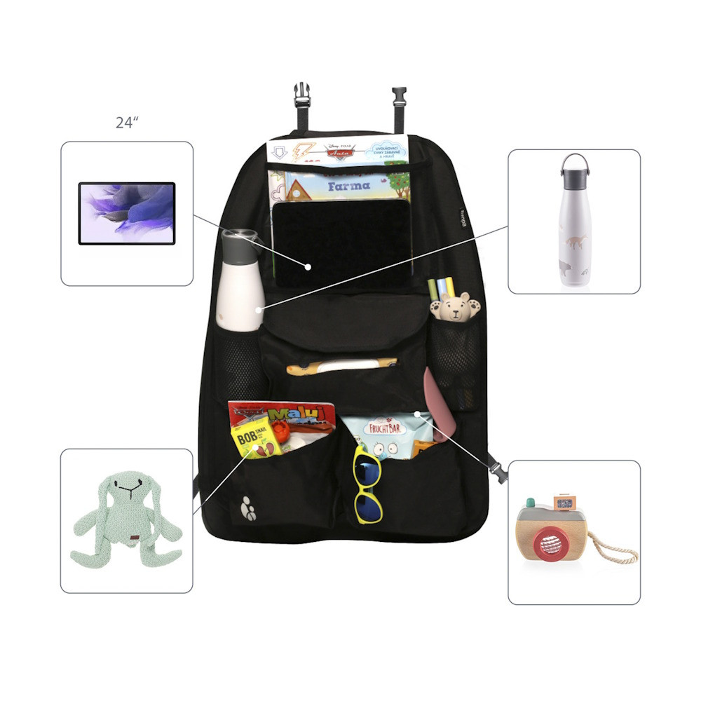 Az ülésre szerelhetõ intelligens és hatékony szervezõ nem csupán az Ön útját teszi kellemesebbé, hanem a tablet tartó zsebnek köszönhetõen a gyerekekét is, akiket leköt a mesenézés. A rendezõben két palack is elhelyezhetõ, úgyhogy nem kell attól tartania, hogy kiömlene a tartalmuk. A zsebkendõtartó zseb, valamint az egyéb tárgyak, például játékok tárolására szolgáló további két darab mély zseb kellemes útitárssá varázsolják a rendezõ, amely segít akkor is rendet tartani a kocsiban, ha a legkisebbekkel utazik. A csatoknak köszönhetõen a rendezõ egyszerûen rögzíthetõ az ülés hátoldalára, valamint egyszerûen le is vehetõ róla.