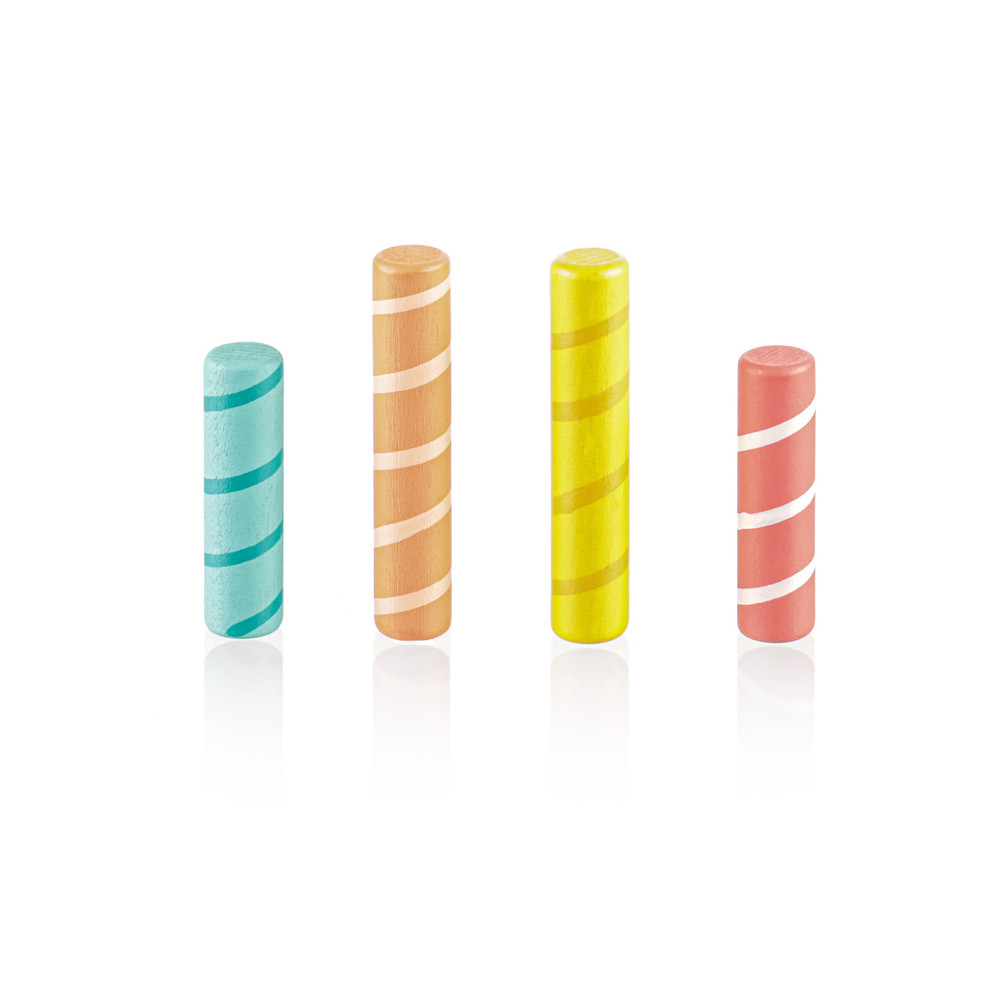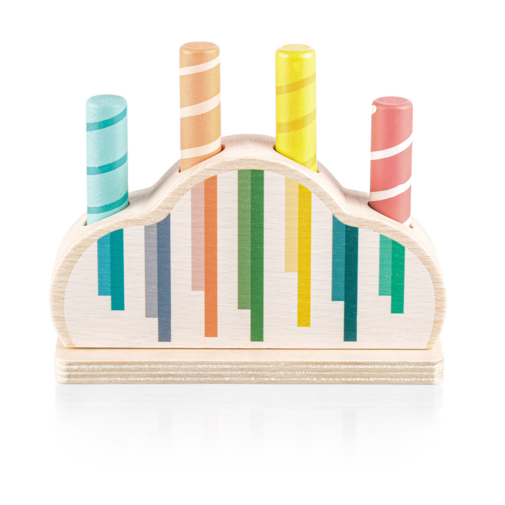 Színes csapok vannak rögzítve egy színes, rugóval ellátott fa alapba. Ha ezeket a csapokat finoman megnyomják, kioldódnak, és a rugó lehetõvé teszi, hogy kiugorjanak. A játék fejleszti a motoros készségeket, a koordinációt és a koncentrációt, így ideális a korai tanuláshoz. Természetes bükkfából és vízbázisú festékekbõl készült.