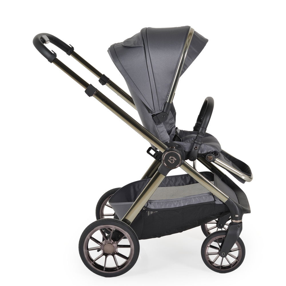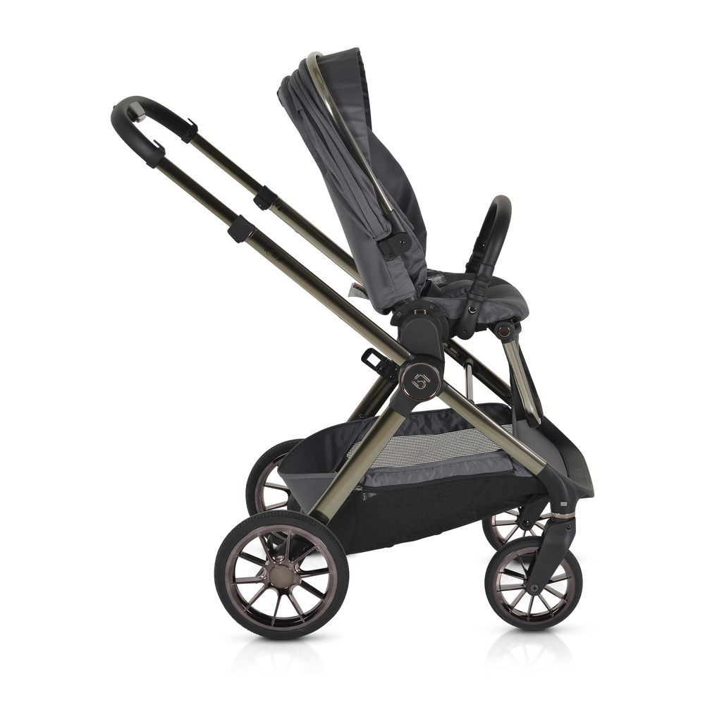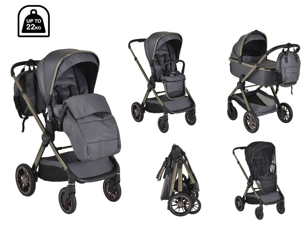 iCLICK Babakocsi 2in1 szett 22kg-ig terhelhető, aluminium, színben passzoló váz, fordítható ülés, automatán csukható. Ehhez a babakocsi szetthez tartozik a vázra adapterrel illeszthető mózeskosár jó minőségű matraccal és egy sportrész, amely a vázzal együtt mindkét irányban laposra, kicsire összecsukható. Az autós hordozó nem a szett része, külön vásárolható meg. A Macan/Icon I-SIZE típusú autós hordozóval kompatibilis.